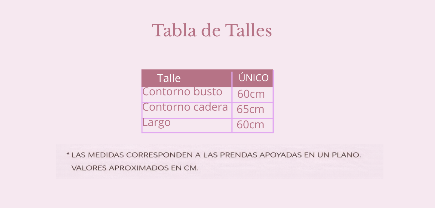 Por su moldería amplia, se adapta cómodamente a distintos talles. Es talle único