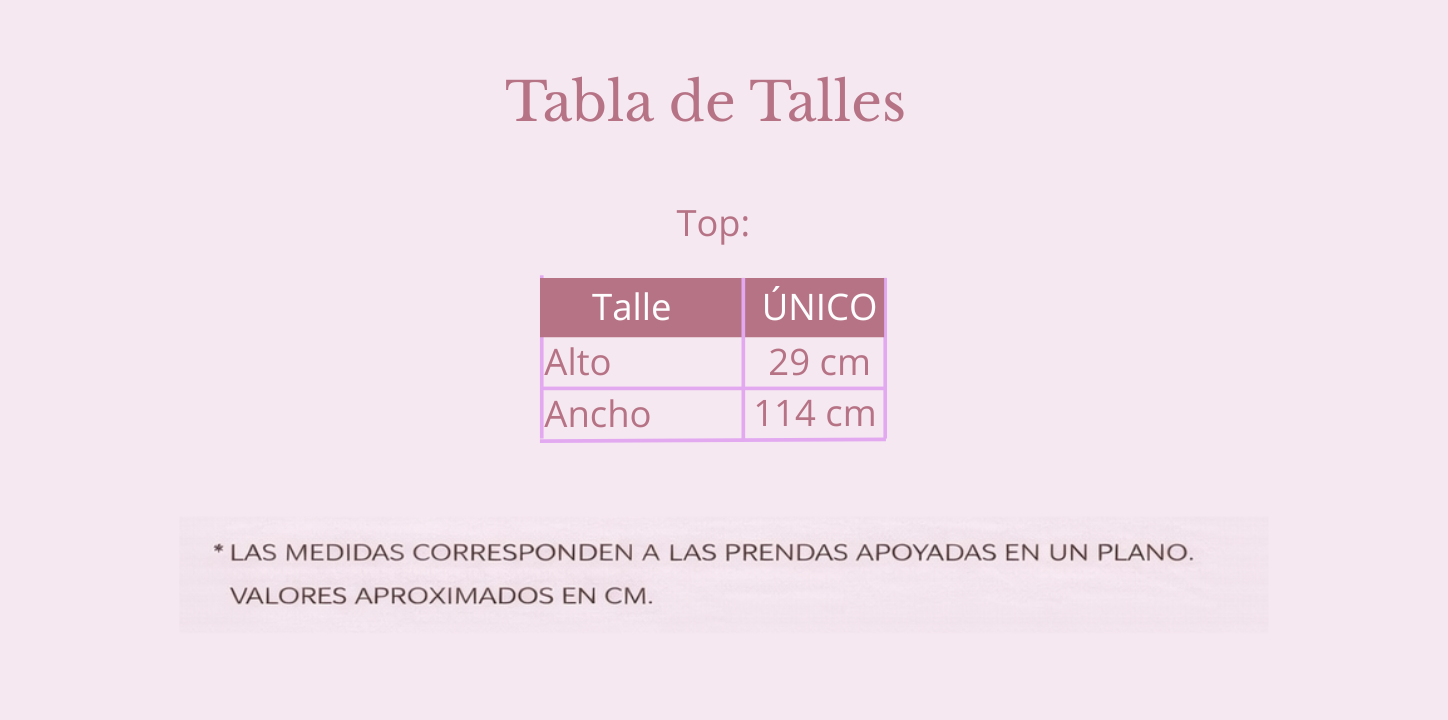 Este producto es talle único y se adapta al cuerpo, por lo que abarca varios talles gracias a su tejido flexible y diseño regulable.